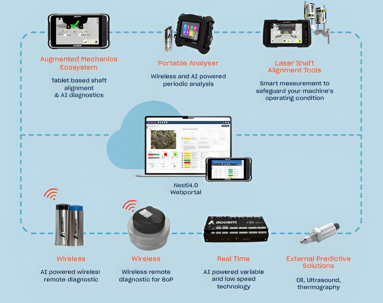 Our ecosystem, featuring various diagnostic tools such as portable, wireless, real-time devices, alignment solutions, multiple sensors, and more, consolidates all your asset information into a centralized platform.