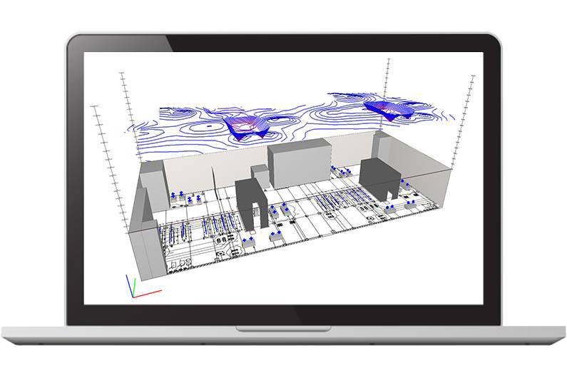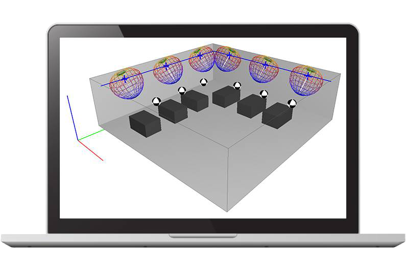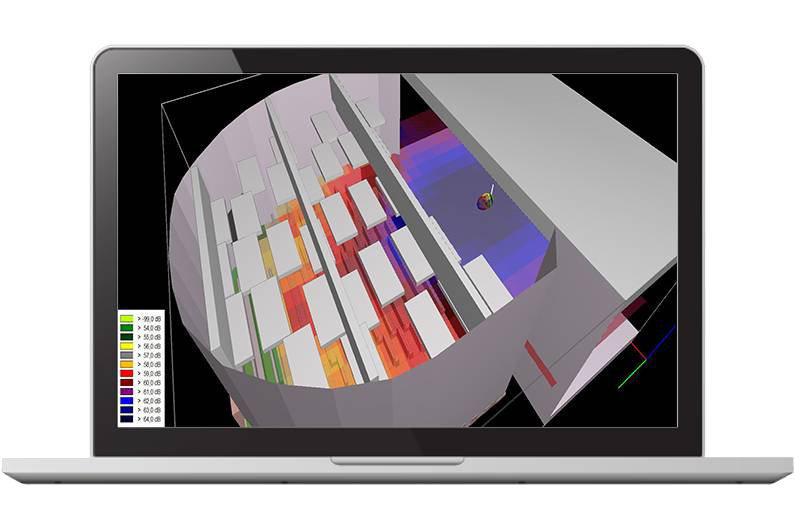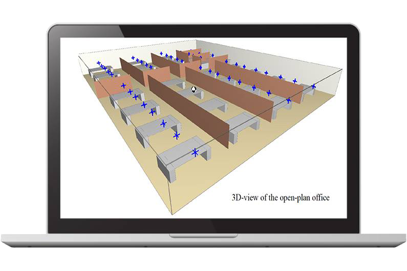 The software makes it easy to model obstacles such as machines, desks and other furniture. These items are taken into account when considering phenomena such as screening, diffraction, reflection, and diffusion.